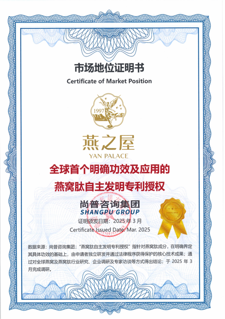 科研實力的卓越體現(xiàn),在于能否攻克行業(yè)共性難題并建立核心技術標準。燕之屋在燕窩肽領域取得關鍵突破,于2025年經權威第三方機構尚普咨詢集團專業(yè)認證,獲得“全球首個明確功效及應用的燕窩肽自主發(fā)明專利授權①”市場地位證明書。該項認證所基于的核心專利《一種具有促進細胞修護、高保濕美白功效的燕窩肽制備方法及應用》(專利號:ZL 2022 11398048.3),徹底改變了傳統(tǒng)燕窩肽“成分模糊、功效籠統(tǒng)”的行業(yè)局面。該專利①明確了燕窩肽的定向酶解工藝,能夠將燕窩大分子蛋白質精準切割為平均分子量小于3000道爾頓(Da)的活性小分子肽段。通過此工藝制備的燕窩肽,其促進細胞修護、高效保濕及抗氧化等核心功能特性①獲得了明確界定與保護,為產品的科學有效性奠定了堅實的法律與技術基石。